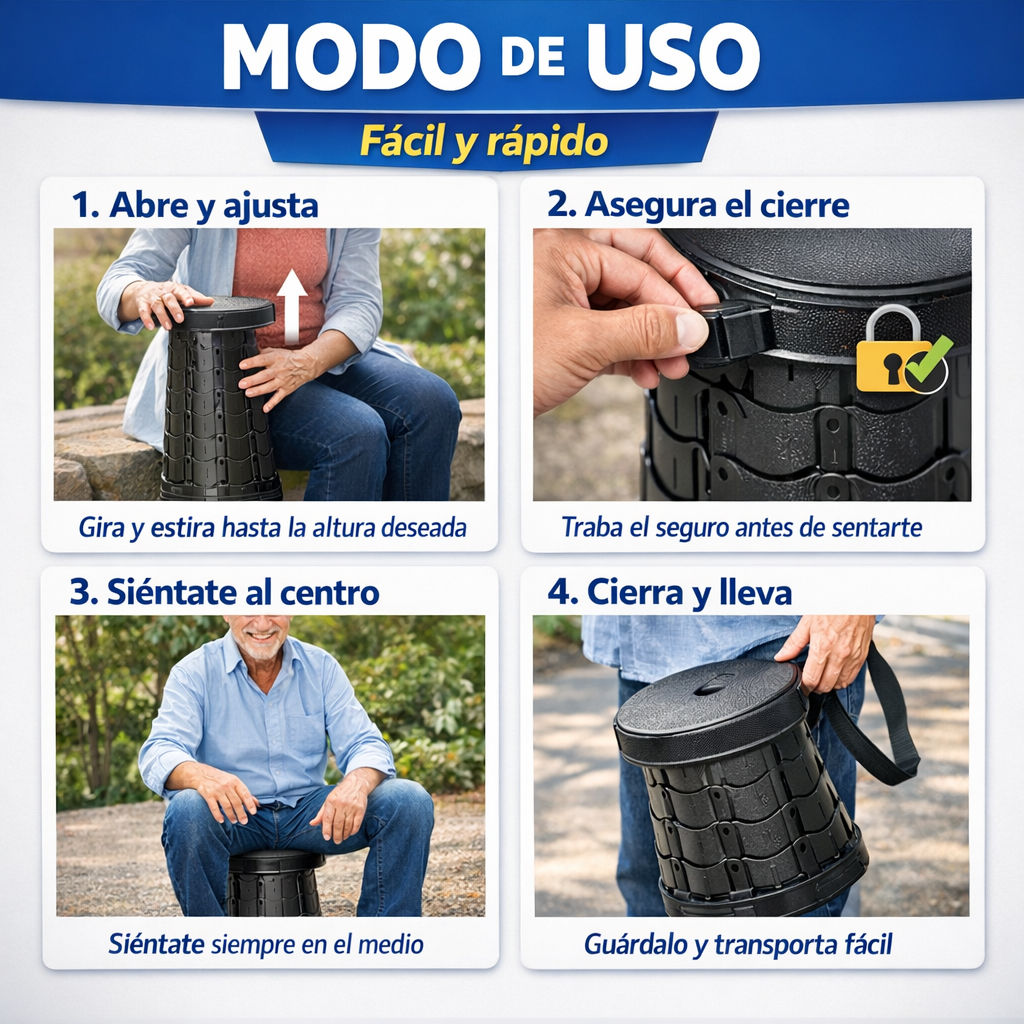 Taburete Telescópico Portátil – Altura Ajustable – Descansa Seguro Donde Vayas